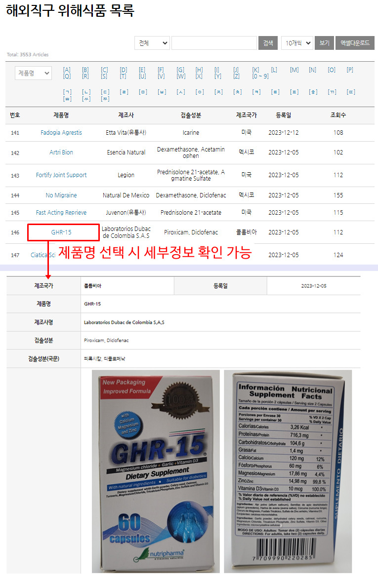 참고로 진통효과를 광고한 제품은 보스웰리아, 칼슘, 마그네슘 등을 원료로 사용한 것으로 표시했으나 스테로이드제 성분인 '덱사메타손', '프레드니솔론 21-아세데이트', 소염진통제 성분인 '디클로페낙' '피록시캄', '멜록시캄', 해열진통제 성분인 '아세트아미노펜' 등이 검출됐다. 이들 성분은 오남용할 경우 심혈관계, 소화기계 등에 심각한 부작용을 유발할 수 있다.