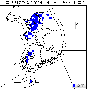 이에 앞서 제주도(제주도동부)에도 호우경보가, 인천과 충청남도(아산시·예산군·홍성군·태안군·당진시·서산시)·서해5도·경기도(광명시·과천시·시흥시·부천시·가평군·의정부시·안양시·구리시·남양주시·오산시·평택시·군포시·의왕시·하남시·용인시·광주시)·전라남도(무안군·영광군·신안군) 등에도 호우주의보가 발효됐다.