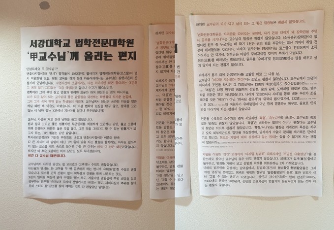 지난 19일 서강대 X관에 '서강대 법학전문대학원 甲(갑) 교수님께 올리는 편지'라는 제목으로 '서강대 법학전문대학원 학생 乙(을)'이 올리는 대자보가 붙었다.