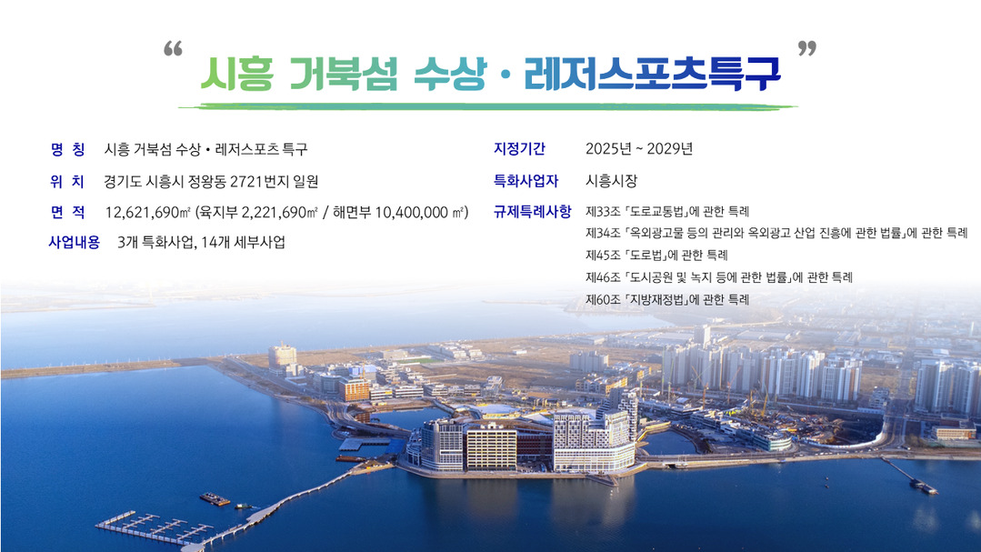 임병택 시장은 "이번 특구 지정으로 더욱 다양한 사업의 유치와 운영이 가능해지는 만큼, 거북섬 지역 경제 활성화에 기여할 수 있도록 최선을 다하겠다"고 밝혔다.