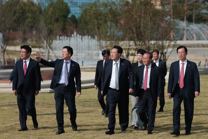 ▲ 윤석열 대통령이 18일 국민의힘 김기현 대표 등 지도부와 오찬 회동을 한 뒤 서울 용산어린이정원에서 산책하고 있다. [대통령실 제공]