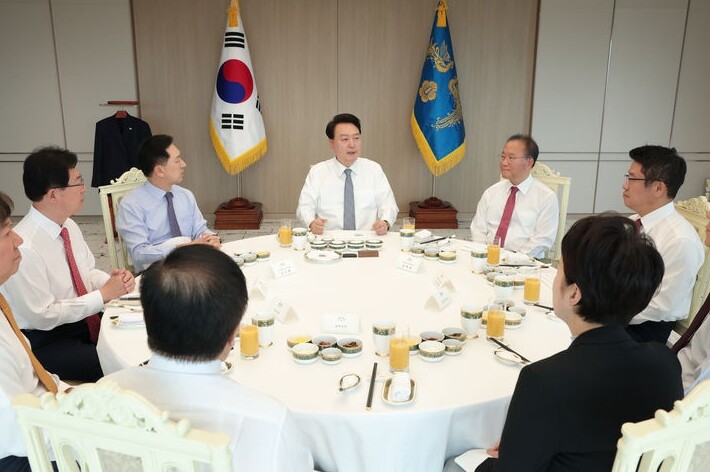 김 대표 등은 전날 대통령 직속 국민통합위원회 만찬 행사에 참석했다. 대통령과 여당 지도부가 소통하는 일정이 연이틀 진행된 것이다.