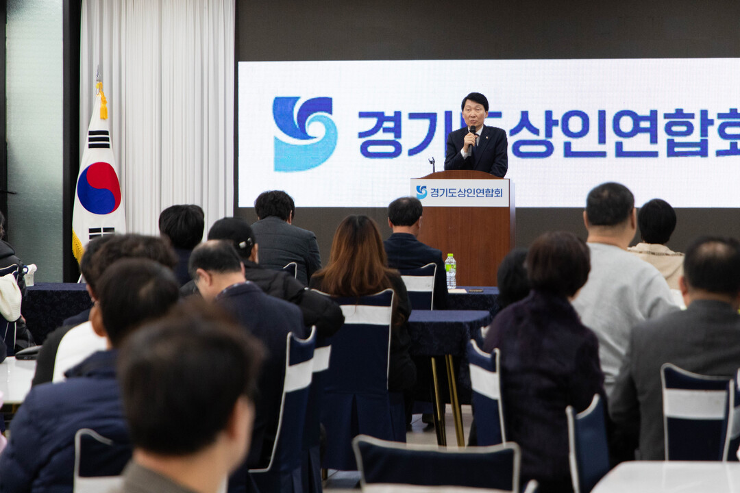 ▲ 지난 26일 안산 에리카 컨벤션센터에서 열린 경기도상인연합회 정기총회에서 김민철 경상원장이 인사말을 하고 있다. [경상원 제공]