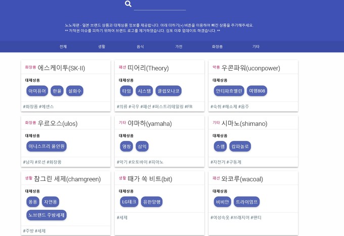 지난 11일 만들어진 '노노재팬'은 일본 제품과 이를 대체할 정보를 공유하는 사이트다. 이 사이트에는 생활, 음식, 가전, 화장품 등 품목별로 일본 상품을 구분해 대체할 수 있는 정보가 나열돼 있다.