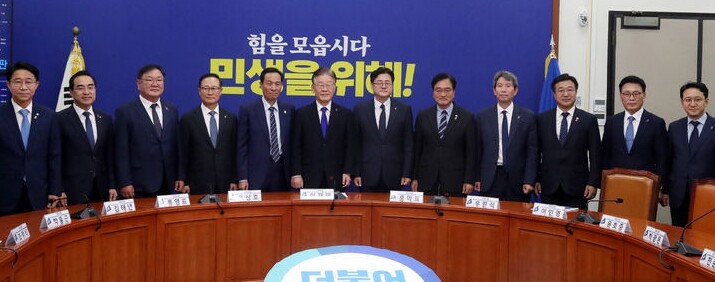 | ▲ 더불어민주당 이재명 대표가 26일 국회에서 전·현직 원내대표와 간담회 시작 전 기념촬영을 하고 있다. [뉴시스] |