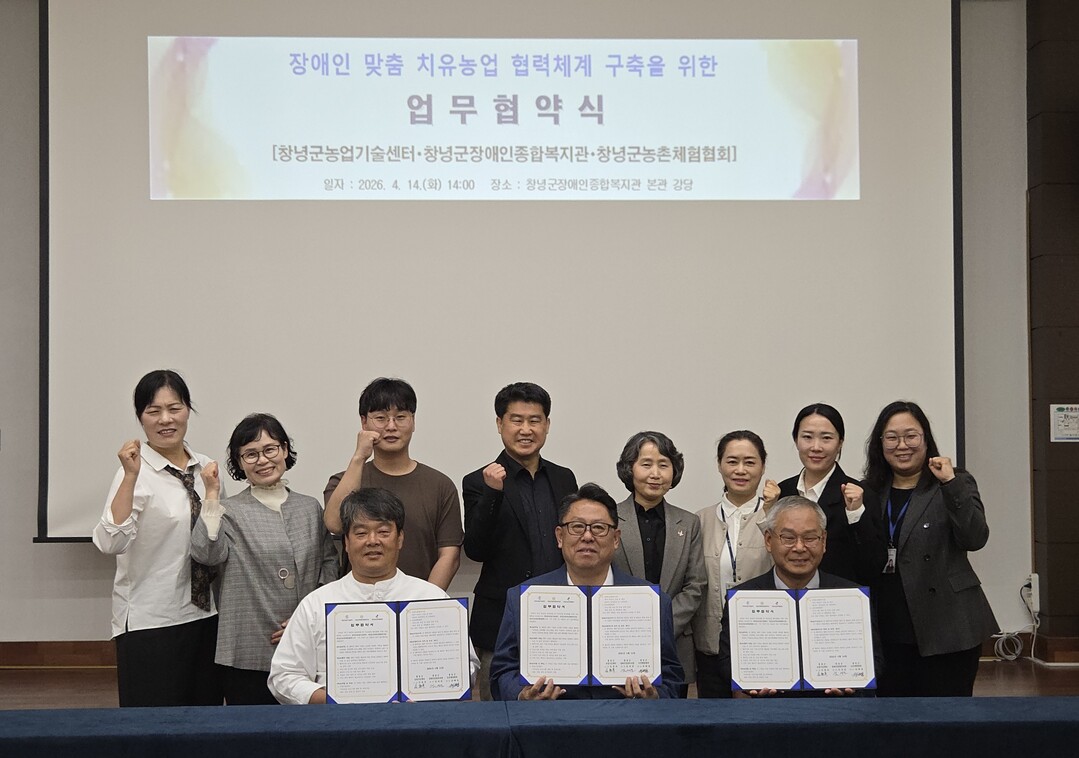 창녕군은 지난 14일 창녕군장애인종합복지관에서 농업기술센터, 장애인종합복지관(관장 김성길), 농촌체험협회(회장 장해동) 간 치유농업 활성화 및 장애인 복지 증진을 위한 업무협약(MOU)을 체결했다.