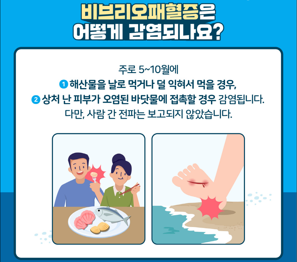 비브리오패혈증은 주로 5~6월경부터 발생해 8~9월에 가장 많이 발생한다. 어패류를 날것으로 섭취하거나 덜 익혀 먹는 경우, 또는 피부에 상처가 있는 상태에서 바닷물에 접촉할 경우 감염될 수 있다.