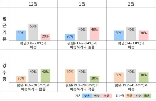 월 평균기온은 평년(0.4∼1.8도)과 비슷하고, 월 강수량도 평년(19.2∼41.4㎜) 수준일 것으로 전망된다.
