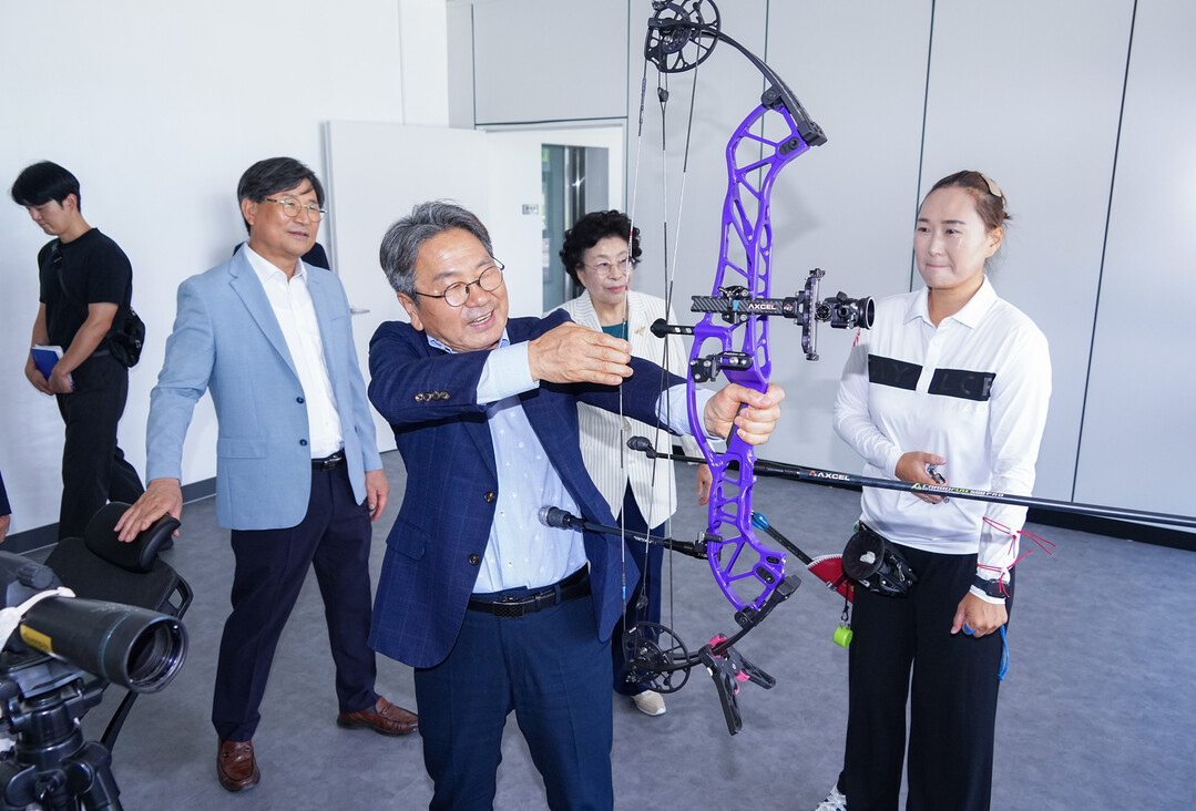 | ▲ 강기정 광주광역시장이 20일 오전 2025 광주 세계양궁선수권대회를 앞두고 남구 광주국제양궁장을 찾아 성공개최를 위한 최종 시설점검을 하고 광주시청 양궁팀 선수의 컴파운드 활 시위를 당겨보고 있다. [광주광역시 제공] |