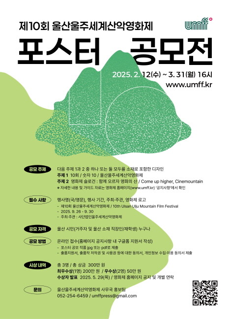 울산울주세계산악영화제(UMFF·움프·집행위원장 엄홍길)는 3월 31일까지 '제10회 움프 포스터 공모전'을 연다고 20일 밝혔다.