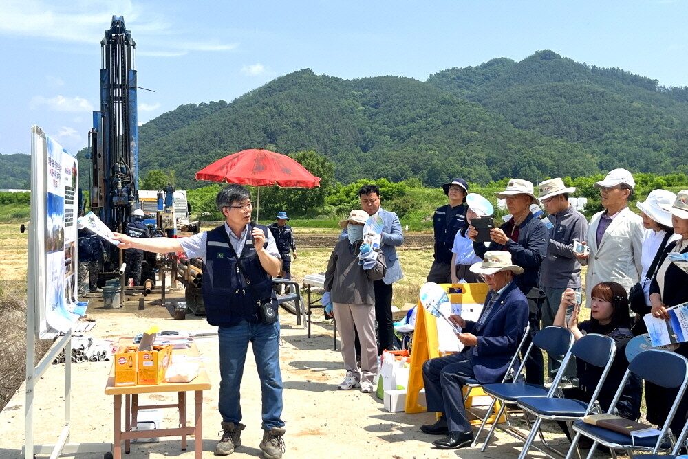 | ▲ 한국지질자원연구원 임재수 박사가 운석 충돌구 시추조사 현장에서 군민설명회를 갖고 있다. [합천군 제공] |