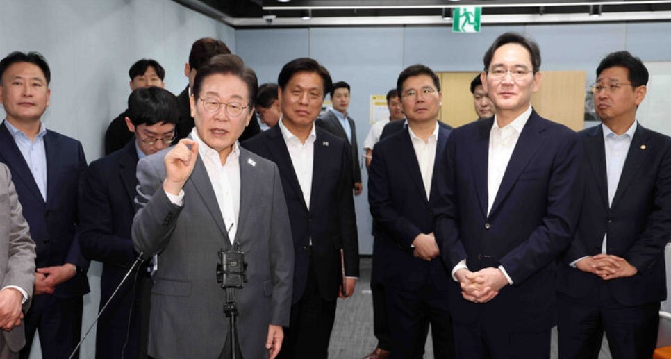 ▲ 이재명 대통령이 더불어민주당 대표 시절인 지난 3월 서울 강남구 역삼동 삼성 청년 소프트웨어 아카데미(SSAFY)에서 이재용 삼성전자 회장을 만나고 있다. [뉴시스]