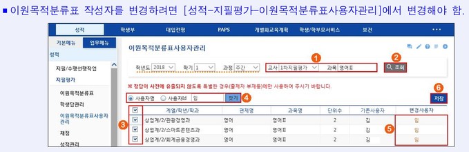 경기도교육정보기록원이 발간한 '2018 나이스 교무업무 매뉴얼(고등학교)'을 보면, '채점 및 점수 입력' 아래 '이원목적분류표'에서 '활용 팁스(Tips)' 중 하나로 "고사 기간 중 이원목적분류표에 대한 작성자를 변경해야 할 경우 성적처리담당교사가 '성적-지필평가-이원목적분류표사용자관리'에서 변경해야 한다"고 명시돼 있다.