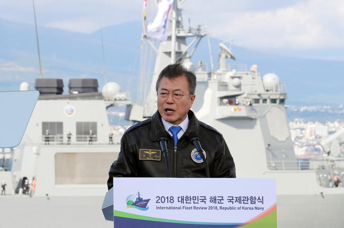 문 대통령은 이날 오후 제주도 서귀포 앞바다의 '2018 국제 관함식'에 참석해 좌승함인 일출봉함에서 연설했다. 문 대통령이 해군기지 건설로 큰 갈등을 빚은 강정마을이 있는 제주를 찾아 주민들을 위로한 것은 이번이 처음이다.