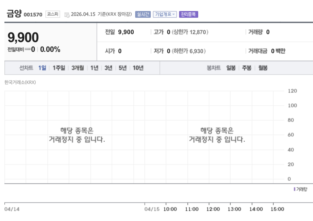 | ▲ 금양 주식이 거래정지 상태임을 보여주는 15일자 네이버 증권 화면. [네이버증권 캡처] |