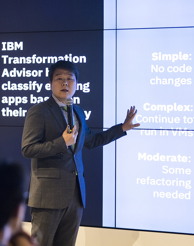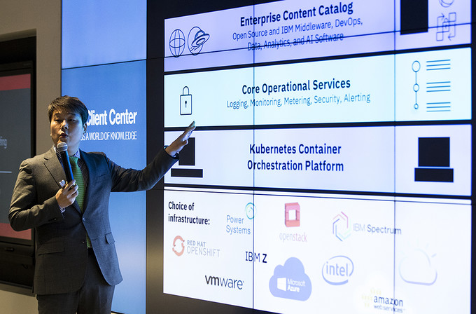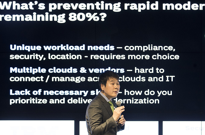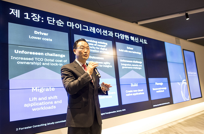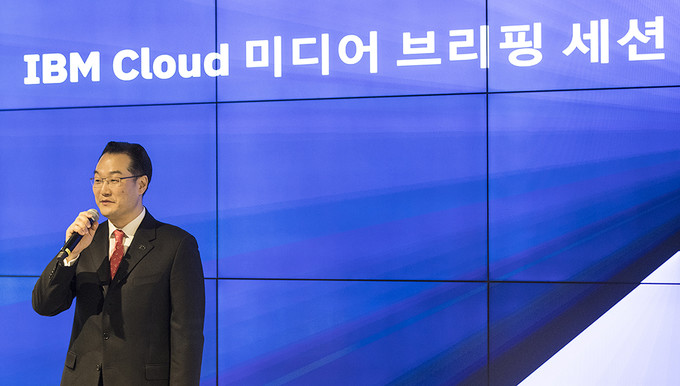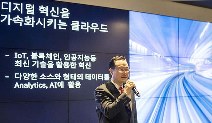 한국IBM 클라우드 및 코그너티브 소프트웨어 사업총괄 김종훈 전무가 16일 오전 서울 영등포구 서울국제금융센터에서 열린 한국IBM 하이브리드 클라우드 미디어 세션에서 '기업의 디지털 혁신 가속화를 위한 클라우드 여정'에 대한 발표를 하고 있다.