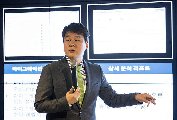 한국IBM 하이브리드 클라우드 영업 총괄 김강정 상무가 16일 오전 서울 영등포구 서울국제금융센터에서 열린 한국IBM 하이브리드 클라우드 미디어 세션에서 'Joumey to Cloud - Hybrid & Multi Cloud'에 대한 발표를 하고 있다.