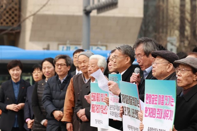 ▲ 한글 단체들이 7일 서울 광화문광장 세종대왕동상 앞에서 '배달겨레 얼말글 빛내기 기자회견'을 열었다. [한글 단체 소희연 제공]