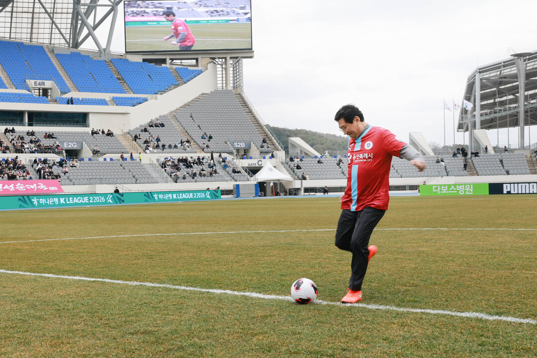 ▲ 용인FC 구단주인 이상일 용인시장이 지난 1일 미르스타디움에서 열린 하나은행 K리그2 홈 개막전에서 시축을 하고 있다. [용인시 제공]