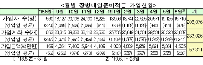 금융위원회는 지난해 8월 29일 출시된 장병내일준비적금 가입자 수가 20만6076명으로 집계됐다고 1일 밝혔다.