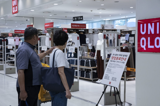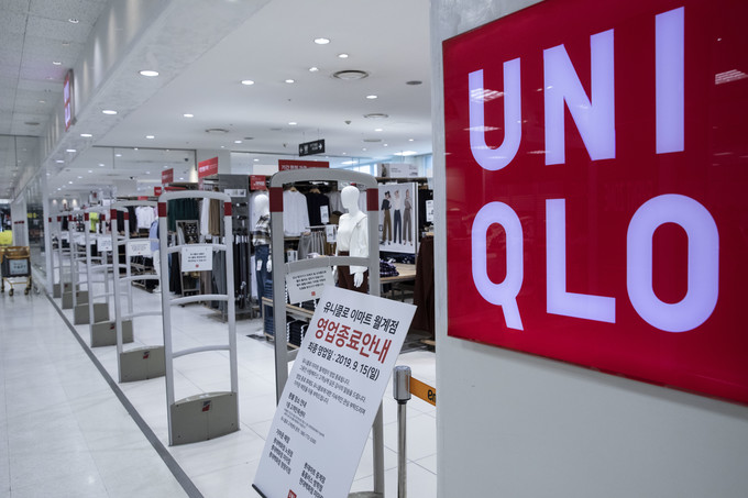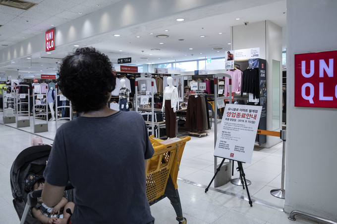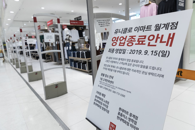 한국에 대한 일본의 수출규제로 촉발된 불매운동이 지속되고 있는 19일 오후 서울 노원구 유니클로 월계점에 '다음 달 15일 영업종료를 알리는 안내문'이 세워져 있다.