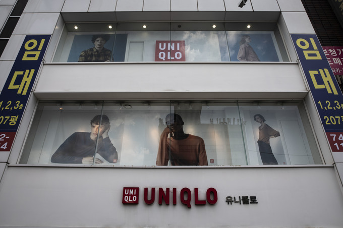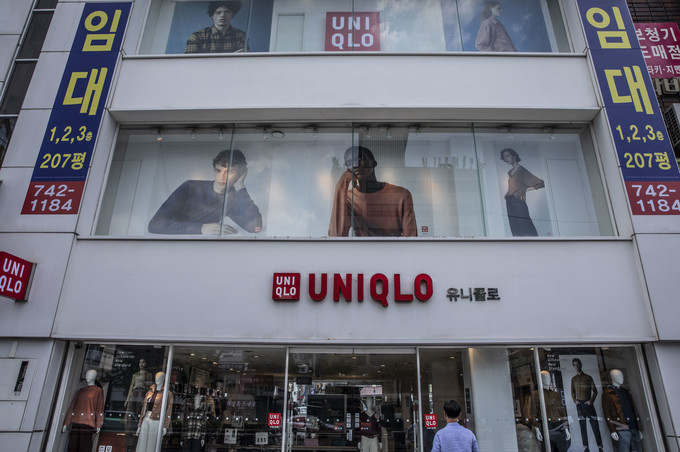 한국에 대한 일본의 수출규제로 촉발된 불매운동이 지속되고 있는 19일 오후 서울 종로구 유니클로 종로3가점 외벽에 임대문의 현수막이 걸려 있다.