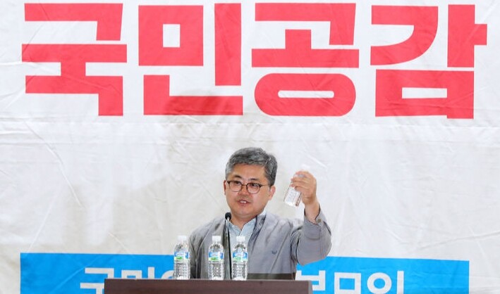 ▲ 함운경 국민동행 전북지부 대표가 지난해 6월 28일 국회에서 열린 국민의힘 공부모임 '국민공감'에서 '후쿠시마 원전 처리수를 둘러싼 과학과 괴담의 싸움-어민과 수산업계의 절규를 듣다'를 주제로 강연하고 있다. [뉴시스]