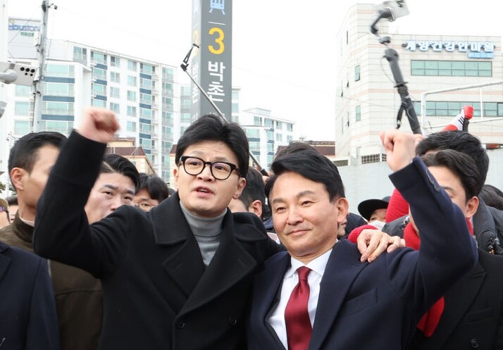 한 위원장은 박촌역 앞에서 원 후보자의 어깨에 손을 두르고 "저와 원희룡의 인생을 봐달라. 우리는 무엇인가를 이뤄내기 위해 최선을 다해 온 사람"이라며 "우리와 이재명의 인생을 비교해달라"고 말했다.