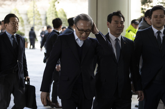 ▲ 최근 항소심에서 조건부로 석방된 이명박 전 대통령이 13일 오후 서울 서초구 고등법원에서 열린 항소심 재판에 출석하고 있다. [문재원 기자]
