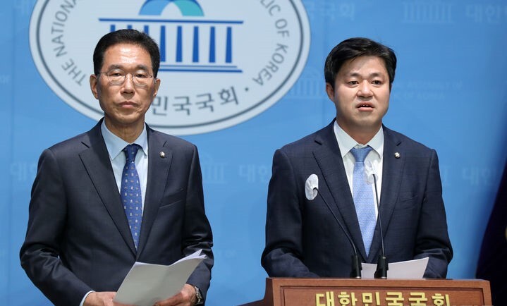 ▲ 더불어민주당 김주영·박상혁 의원이 5일 오전 서울 여의도 국회 소통관에서 김포 서울 편입 관련 입장 발표 기자 회견을 하고 있다. [뉴시스]
