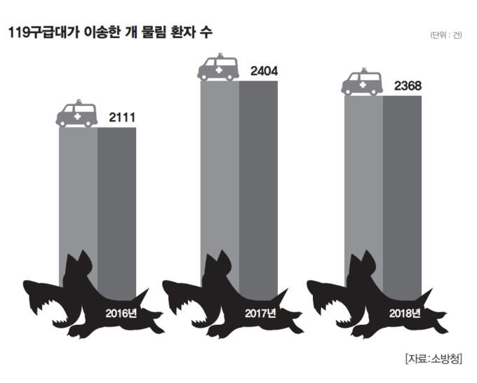 소방청 통계에 따르면 최근 3년간 119구급대가 이송한 전국 개 물림 환자는 모두 6883명으로, △ 2016년 2111명 △ 2017년 2404명 △ 2018년 2368명으로 집계됐다. 특히 야외활동이 많은 5월부터 10월까지는 월 평균 226명이 개에게 물려 다른 달(평균 191명)보다 18% 정도 증가하는 것으로 분석됐다.