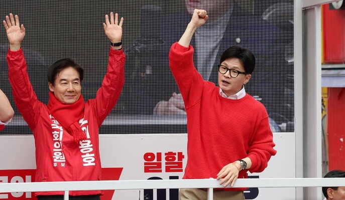 | ▲ 국민의힘 한동훈 비대위원장이 28일 서울 서대문구 신촌에서 열린 집중유세에서 이용호 서대문갑 후보의 지지를 호소하고 있다. [뉴시스] |