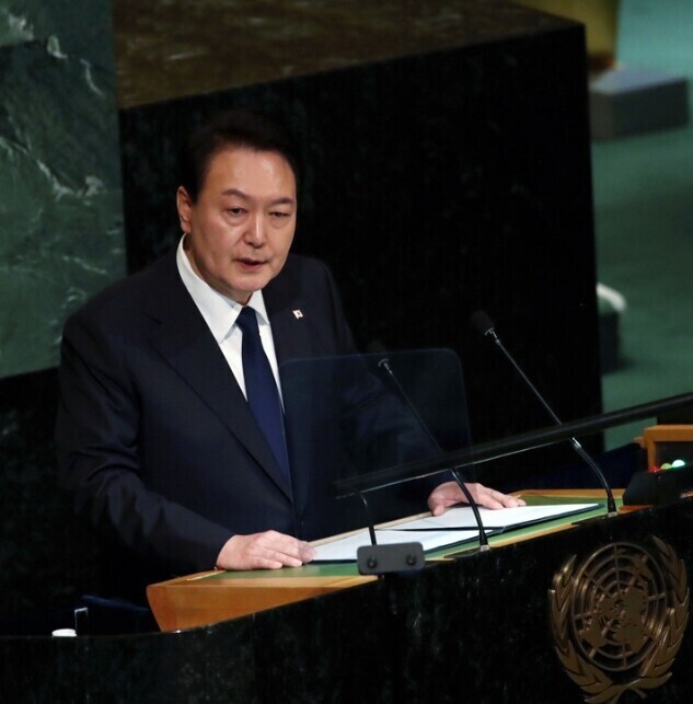 | ▲ 윤석열 대통령이 지난해 9월 20일(현지시간) 미국 뉴욕 유엔 총회장에서 기조연설을 하고 있다. [뉴시스] |