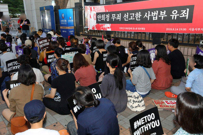 이들은 '가해자 좋으라고 만든 법이 아닐 텐데?' '가해자는 감옥으로, 피해자는 일상으로' '사법정의는 죽었다' 등의 문구가 적힌 피켓을 들고 "안희정이 무죄라면 사법부는 유죄"라고 외쳤다.