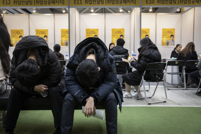 21일 인천광역시 연수구 송도컨벤시아에서 열린 2018 KB 굿잡 우수기업 취업박람회장을 찾은 학생들이 지쳐 앉아있다.