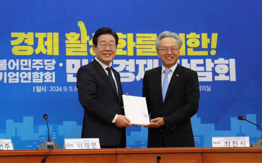 | ▲ 이재명 대통령이 더불어민주당 대표 시절이던 지난해 9월 11일 국회에서 최진식 한국중견기업연합회장과 만나 기념촬영하고 있다. [한국중견기업연합회 제공] |