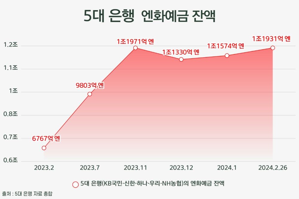 지난해 2월 말 기준 6767억 엔 수준이었던 5대 은행 엔화예금 잔액은 늘어나는 추세다. 약 1년 만에 76.3%(5164억 엔) 급증했다.