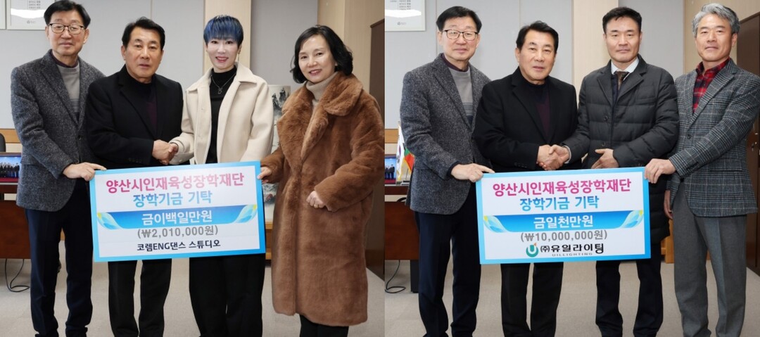 물금읍 코렘ENG댄스스튜디오 양산본원(원장 유은정)과 덕계동 ㈜유일라이팅(대표 신장섭)은 4일 양산시인재육성장학재단에 각각 장학기금 201만 원, 1000만 원을 기탁했다.