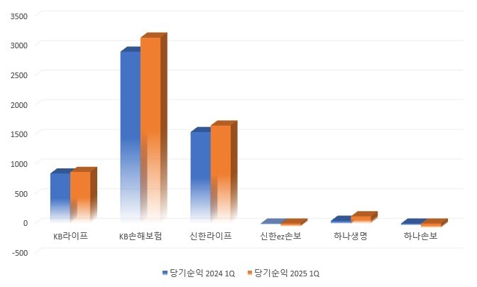 ▲ 4대 금융그룹(KB·신한·하나·우리) 계열 보험사의 2024년 1분기 및 2025년 1분기 당기순이익 현황. [각 금융그룹 경영공시]