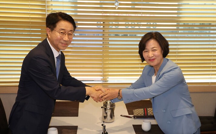 | ▲ 더불어민주당 추미애(오른쪽), 조정식 국회의장 후보가 12일 서울 여의도의 한 식당에서 후보 단일화를 논의하기 위해 만나 인사하고 있다. [뉴시스] |