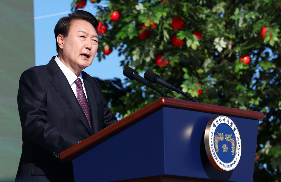 | ▲ 윤석열 대통령이 10일 경기도 수원 서호잔디광장에서 열린 제28회 농업인의 날 기념식에서 축사하고 있다. [뉴시스] |