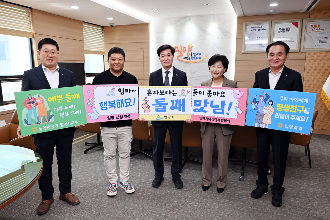 경남 밀양시는 28일 시장실에서 저출산 극복을 위한 '행복해요! 둘째 맛남' 출정식을 가졌다.