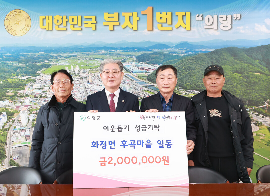 경남 의령군은 화정면 후곡마을 주민들이 지난 23일 이웃돕기 성금 200만 원을 기탁했다고 24일 밝혔다.