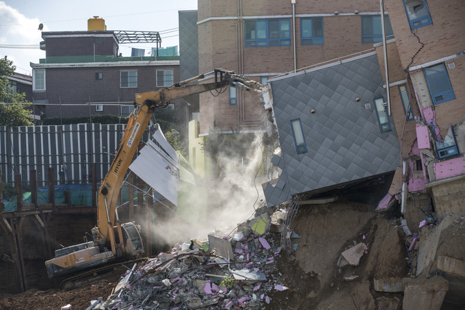 9일 오후 서울 동작구 상도유치원 철거 작업이 진행되고 있다. 상도동 다세대주택 공사장 흙막이가 무너지면서 건물이 붕괴된 상도유치원 철거 작업은 10일 오후까지 진행될 예정이다.