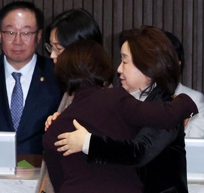 | ▲ 정의당 심상정 의원(오른쪽)이 25일 국회 본회의에서 '의원직 사직안' 통과로 자리를 떠나는 이은주 의원과 포옹 인사를 하고 있다. [뉴시스] |