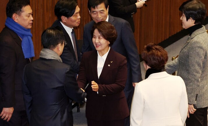 | ▲ 정의당 이은주 의원(가운데)이 25일 국회 본회의에서 의원들과 인사하고 있다. [뉴시스] |