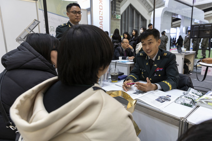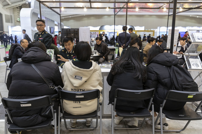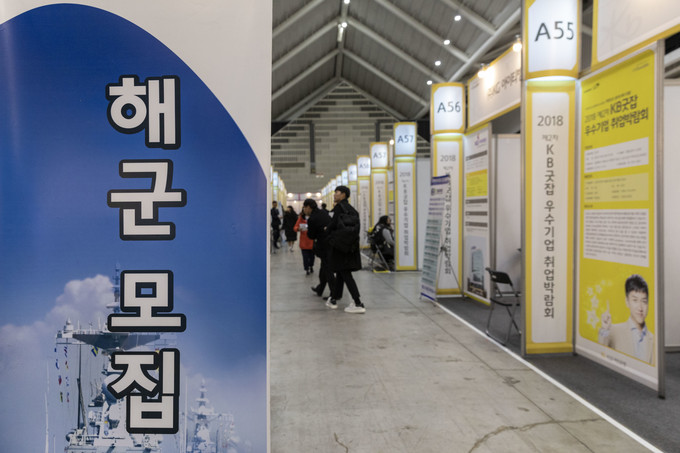 21일 인천광역시 연수구 송도컨벤시아에서 열린 2018 KB 굿잡 우수기업 취업박람회장 해군 부사관 모집 부스를 찾은 학생들이 상담을 하고 있다. 이번 취업박람회는 22일까지 열린다.