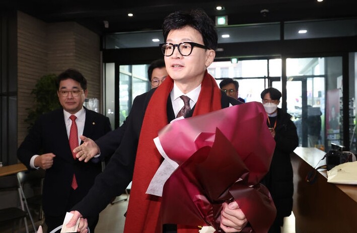 | ▲ 국민의힘 한동훈 비상대책위원장이 26일 서울 여의도 중앙당사에 들어서고 있다. [뉴시스] |