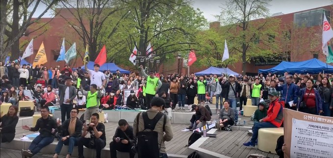 ▲ 420장애인차별철폐공동투쟁단이 20일 서울 종로구 마로니에공원에서 장애인차별철폐 투쟁결의대회를 열었다. [전국장애인차별철폐연대 유튜브 캡처]