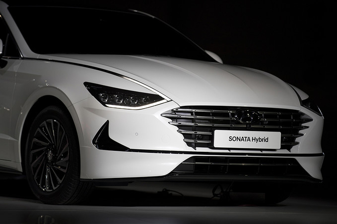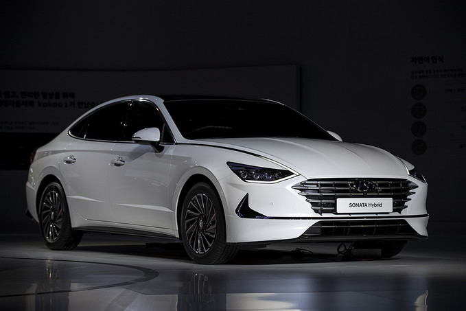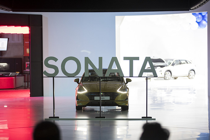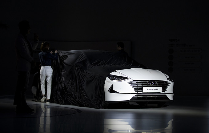 현대자동차가 28일 오전 경기도 고양시 킨텍스에서 열린 2019 서울모터쇼 프레스데이 행사에서 신형 소나타 하이브리드를 공개하고 있다.